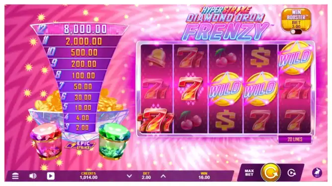 Hyper Strike Diamond Drum Frenzy™ fonctionne sur une configuration à 5 rouleaux et 3 rangées avec 20 lignes de paiement fixes, les gains étant payés de gauche à droite. La structure des paris reste simple, avec des pièces, une valeur de pièce et un multiplicateur de pari fixe de 10. Les symboles Wild remplacent tous les symboles à l’exception des symboles Epic Strike™ et Bonus, ce qui permet d’obtenir des gains réguliers dans le jeu de base.