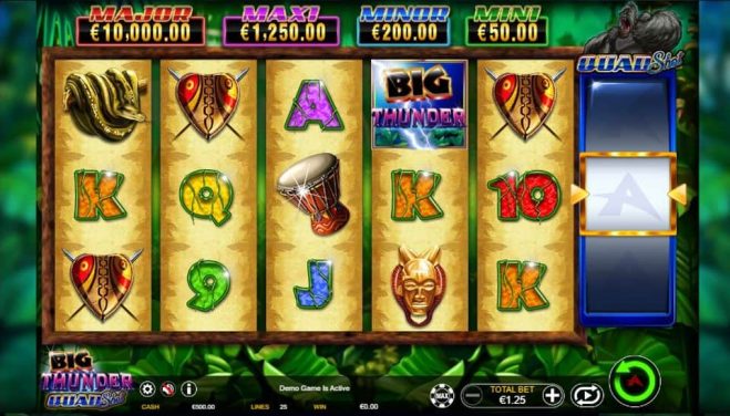 Take a trip deep into the rainforest to claim big jungle jackpots in Big Thunder: Quad Shot. Swing from branch to branch and into thunderous jackpots with the amazing bonus reel feature which awards multipliers up to 5 times your winnings. Journey into the jungle and reap the prizes of Big Thunder Quad Shot slot.