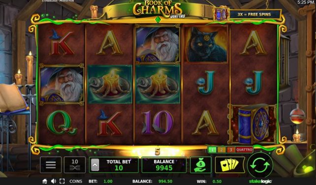Potions magiques, chats noirs, bougies lumineuses et boules de cristal sont à portée de main. Faites grimper vos gains à des niveaux fantastiques et montrez vos talents de sorcier dans Book of Charms Quattro à votre guise.