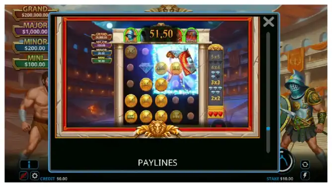 Prepare for battle in Julius Maximus: Legend of the Arena™ — a 5×3, 20-payline slot where every spin is a fight for glory. Wilds and Scatters set the stage, while Sword symbols ignite the Hero vs. Villain duel that leads to the powerful Bonus Feature. Once inside, the reels expand to a 5×5 grid where Diamonds, Coins, and Jackpots await. Each victory unlocks modifiers like More Coins, More Diamonds, or even Inception, where every Diamond triggers a respin. With jackpot wins up to 20,000× and a max potential of 25,000× your bet, the path to greatness has never been more thrilling.