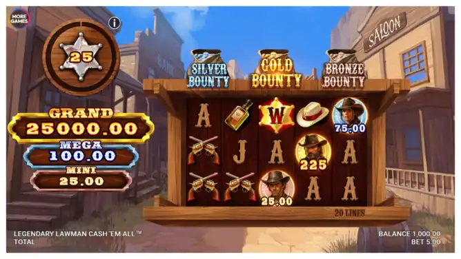Legendary Lawman Cash ’Em All™ drops players into a gritty Wild West showdown where patience, progression, and precision decide the biggest payouts. Instead of relying on instant volatility, this slot rewards long-term play by gradually unlocking stronger mechanics that reshape both the base game and the Bounty Spins feature. Every spin builds authority, turning you from an unknown gunslinger into a feared lawman with access to massive jackpots.
