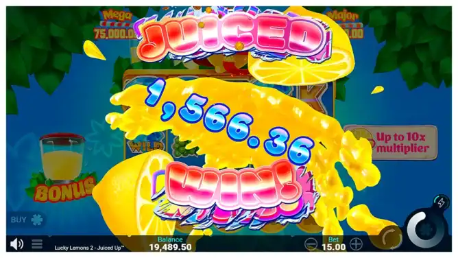 Additionally, the Lemon Booster multiplier increases through 1UP symbols. In the base game, it rises up to 10x. However, during Lucky Spins and Juiced Up Spins, it can climb all the way to 50x. Since the multiplier applies to Collect Wins rather than payline wins, feature rounds can escalate rapidly.