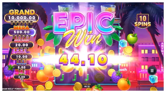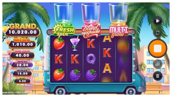 Miami Reels™ Power Combo™ takes players straight into a neon paradise of jackpots, fruits, and fiery bonus features. Played on 5 reels and 3 rows, the slot offers 20 paylines in the base game and expands to 50 paylines in Multi Grow Bonus Spins. Collect Coins for instant prizes, land Star symbols to trigger upgrades, and chase six jackpots — from Mini to Grand — with top wins of up to 10,000× your bet. The real thrill begins when multiple bonus modes trigger together through the Power Combo™ feature, merging fresh spins, fruit upgrades, and win multipliers into one dazzling experience.