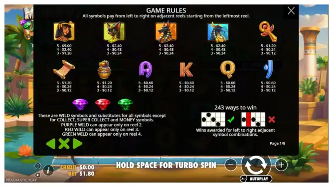 Mummy’s Jewels 100™ is played on a 5-reel, 3-row layout featuring 243 ways to win. Wins pay from left to right across adjacent reels, creating fluid combinations without fixed paylines. However, the real depth emerges through its Money, Collect, and Super Collect mechanics.